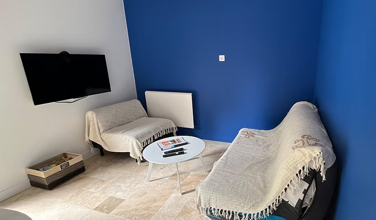 Espace de vie avec cuisine équipée et canapé convertible 2 places.