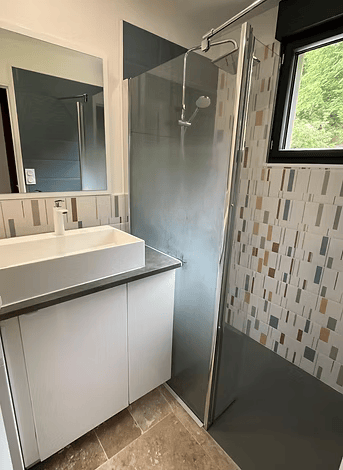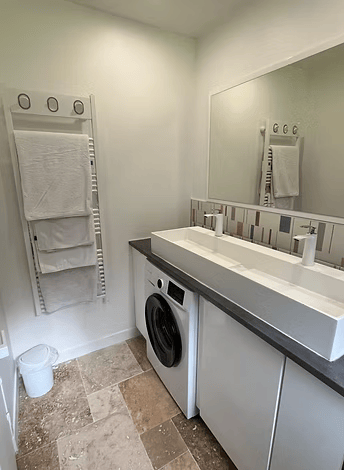Une salle d'eau avec douche et lave -linge. WC séparés.